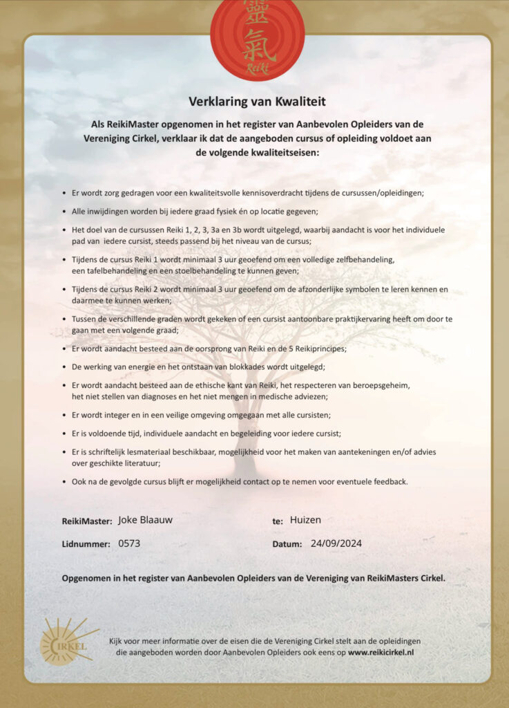 Usui Reiki 2e graad (min. 3 maanden na 1e graad) 2 Dagdelen van 12 uur tot 17 uur
